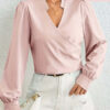 Blusa seda beige, detalles abstracto en negro, manga larga, abertura cuello, botón atrás